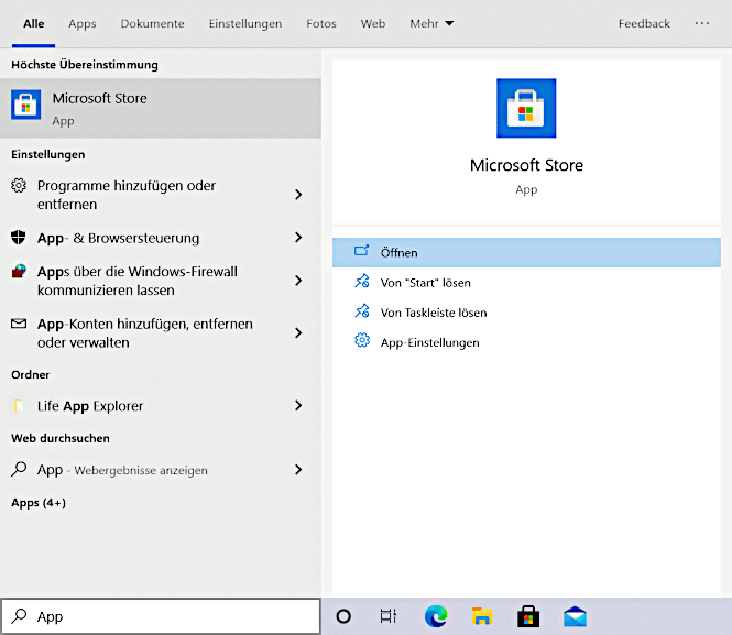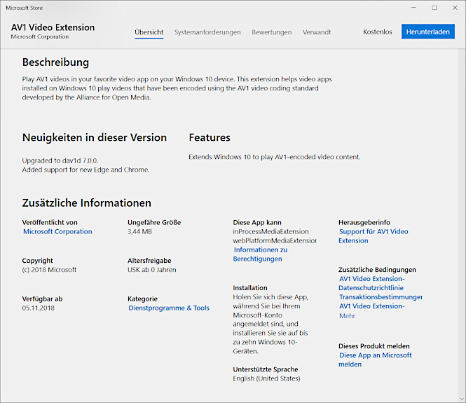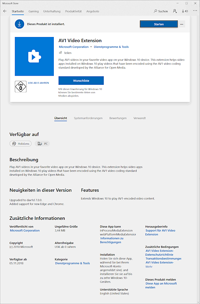 Dazu zunächst den Microsoft Store öffnen, dann AV1 Video Extension suchen, herunterladen und starten: